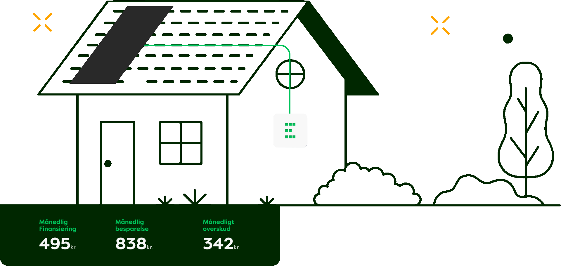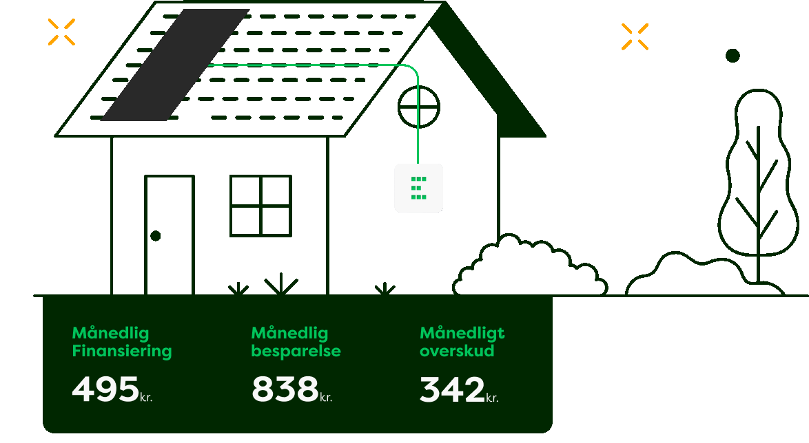 Med grøn finansiering kan et anlæg fås fra 495 kr./md., ofte lavere end den månedlige el-besparelse. Typisk: